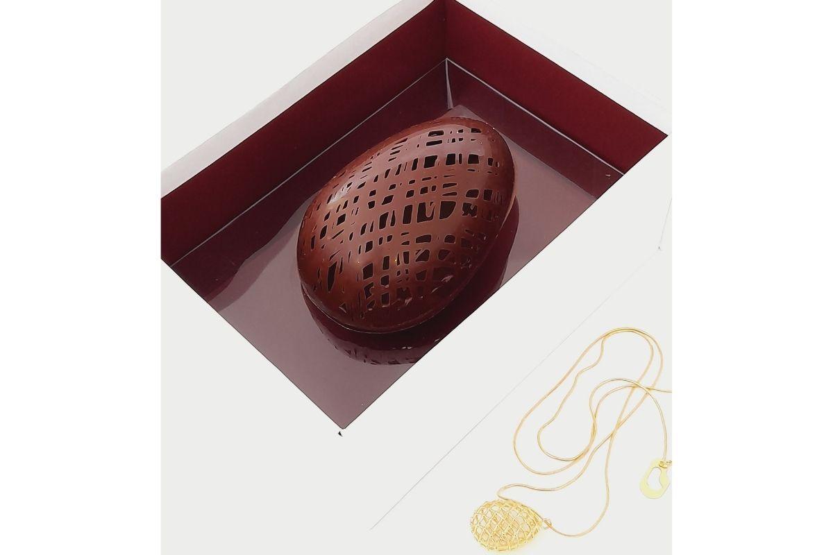 Presentes marcantes e sabores exclusivos fazem parte das novidades da Cuore di Cacao para essa Páscoa 2022. O destaque do ano fica com o Ovo rendado Fabergé acompanhado de uma joia. O chocolate tem duas camadas, uma de Gianduia Latte e outra de Gianduia Nero. A surpresa desse ovo é a gargantilha com pingente Ovo Fabergé assinado pela conceituada designer de joias Silvia Doring. Este presente exclusivo sai a R$ 489.