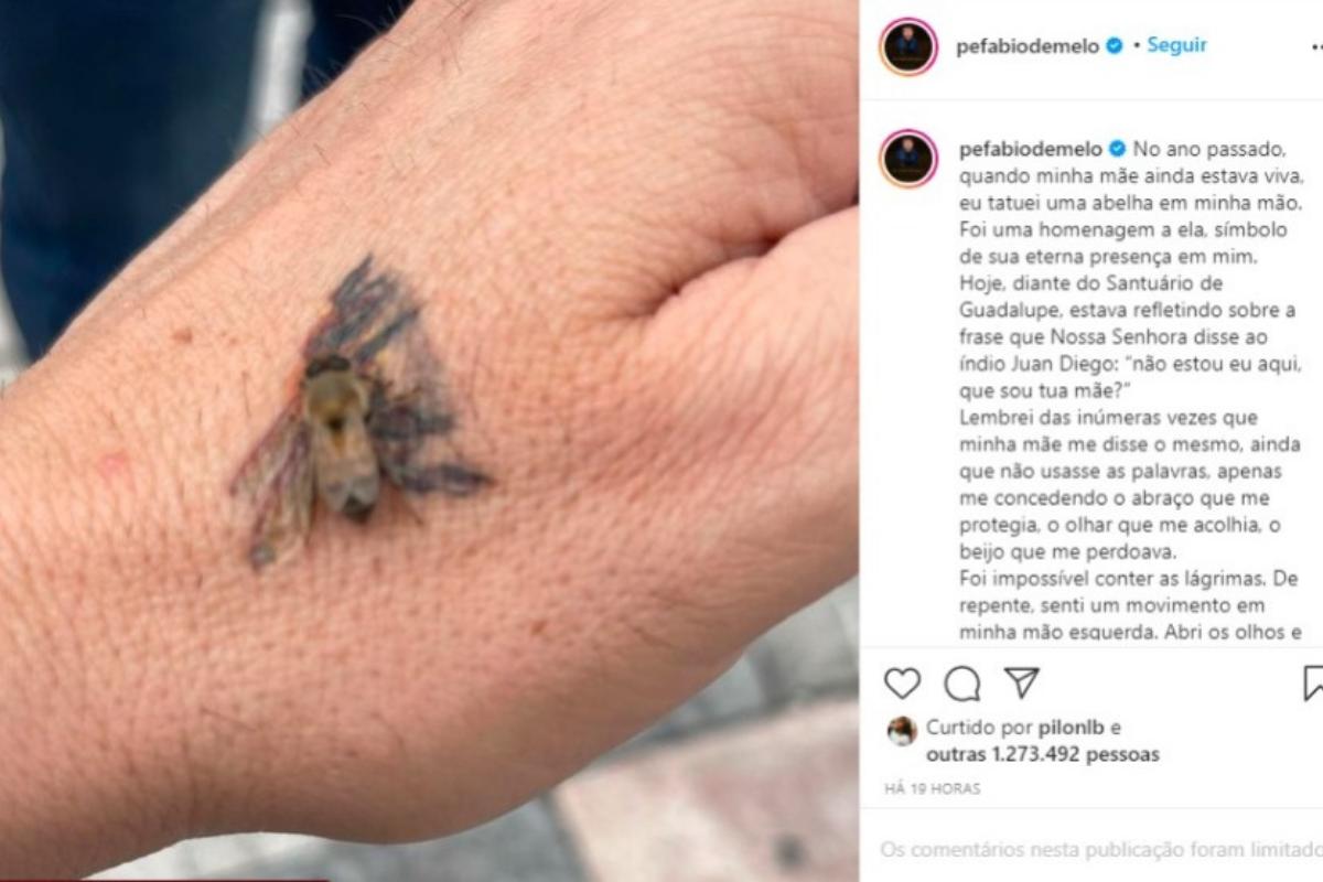 Padre Fabio de Melo fez um post no Instagram para relembrar da mãe, Ana Maria, que morreu em março deste ano por conta de complicações causadas pela covid-19. O padre relatou que teve uma experiência divina, explicando que uma abelha pousou sobre a mãe dele, no local em que tem uma tatuagem do inseto em homenagem a mãe.