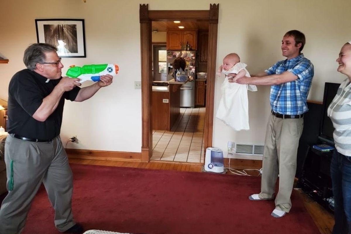 Com o maior bom humor, diversos padres ao redor do mundo precisaram seguir as regras de distanciamento social e para isso, deram um jeitinho de continuar os batismos e bênçãos! Usando armas de brinquedo para manter a distância, eles viralizaram na internet.