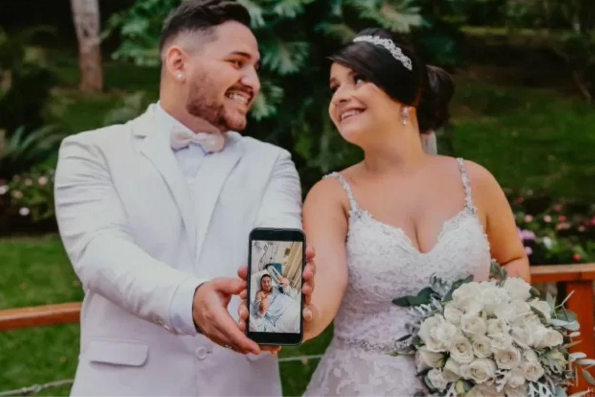 Pai acompanhou o casamento através de uma ligação de vídeo (Foto: Fenix Arte)
