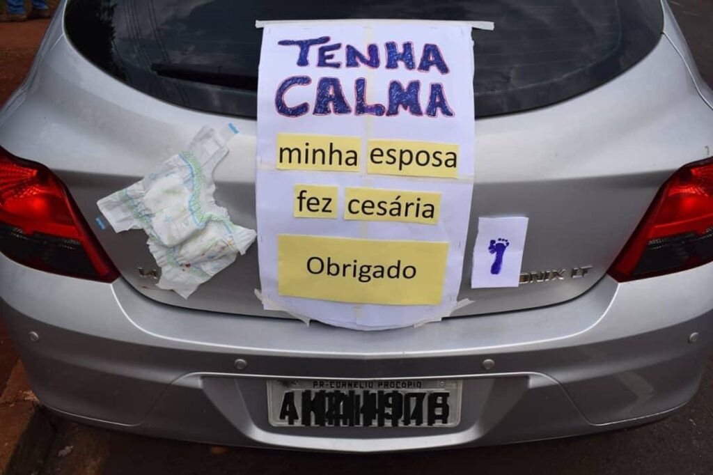 Em Londrina, no Paraná, um pai muito esperto fez um cartaz para a traseira do carro com a frase “Tenha calma, minha esposa fez cesárea. Obrigado!”, ao lado de uma fralda descartável e de um carimbo com o formato do pezinho de um recém-nascido.