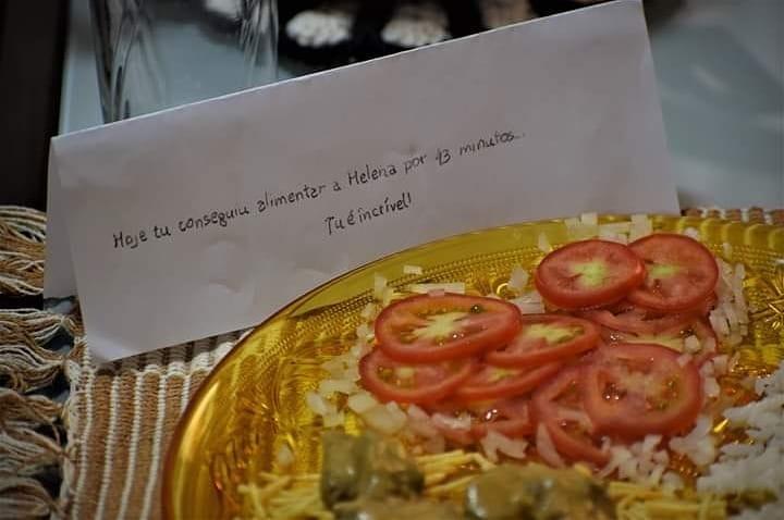 O pai publicou também em seu perfil no Instagram uma foto do prato de comida de sua esposa após o parto, com um recado muito especial: “Hoje, tu conseguiu amamentar a Helena por 43 minutos. Tu é incrível”.