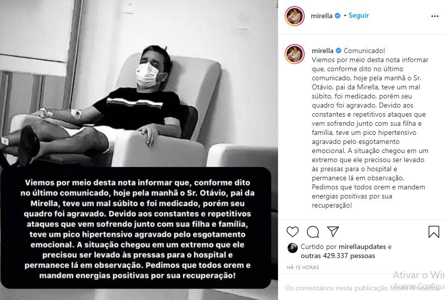 Mas neste sábado (24), a família de Mirella divulgou que Otávio piorou e sofreu um mal súbito. “Viemos por meio desta nota informar que, conforme dito no último comunicado, hoje pela manhã o Sr. Otávio, pai da Mirella, teve um mal súbito, foi medicado, porém seu quadro foi agravado. Devido aos constantes e repetitivos ataques que vem sofrendo junto com sua filha e família, teve um pico hipertensivo agravado pelo esgotamento emocional. A situação chegou em um extremo que ele precisou ser levado às pressas para o hospital e permanece lá em observação. Pedimos que todos orem e mandem energias positivas por sua recuperação!”.