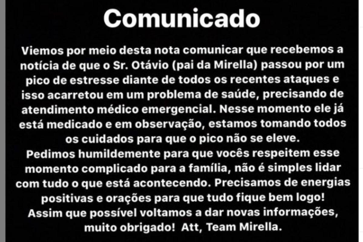O homem precisou ser encaminhado até o hospital e segue em observação. “Viemos por meio desta nota comunicar que recebemos a notícia de que o Sr. Otávio (pai da Mirella) passou por um pico de estresse diante de todos os recentes ataques e isso acarretou em um problema de saúde, precisando de atendimento médico emergencial. Nesse momento ele já está medicado e em observação, estamos tomando todos os cuidados para que o pico não se eleve”, explicaram.