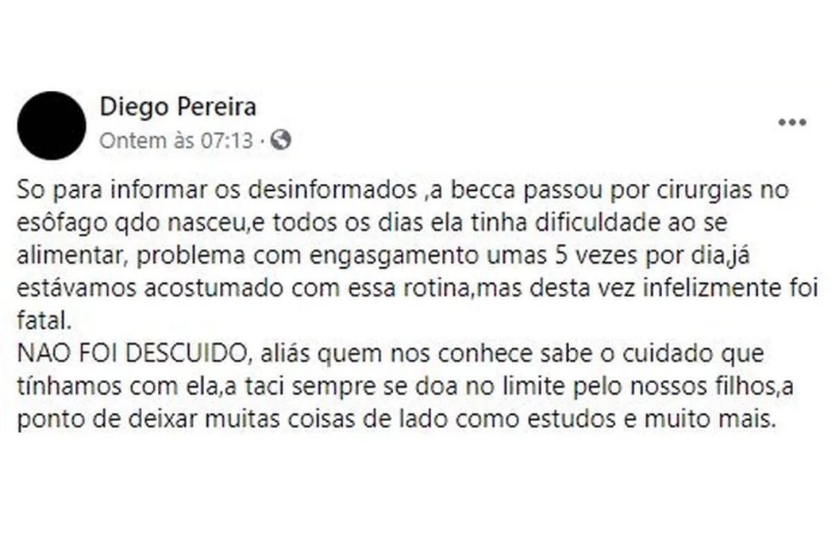 Na publicação, Diego escreveu que todos os dias a filha passava por dificuldades para se alimentar. “Não foi descuido. Quem nos conhece sabe o cuidado que tínhamos com ela”, disse. No momento do acidente, no dia 23 de outubro, Rebeca estava jantando arroz, feijão e nuggets ao lado da mãe e do irmão de 7 anos. Ela chegou a ser encaminhada para o hospital, mas não resistiu durante o trajeto.