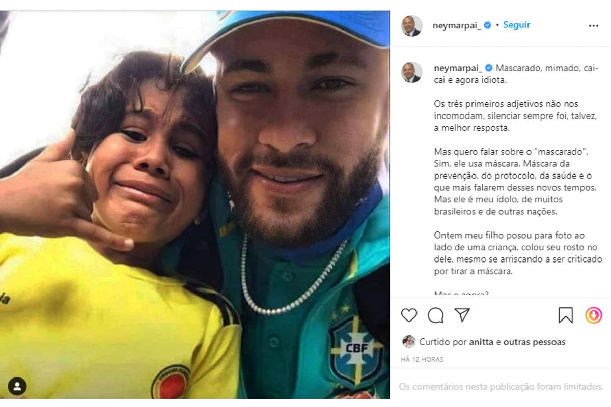 Em seguida, ele falou sobre o registro ao lado da criança, em que Neymar aparece sem máscara: “Ontem meu filho posou para foto ao lado de uma criança, colou seu rosto no dele, mesmo se arriscando a ser criticado por tirar a máscara. Mas e agora? Cadê o respeito pelo ser humano, pela foto eterna em uma vida efêmera… a oportunidade única de um fã. É, meu filho é mascarado e o que você mais quiser.”