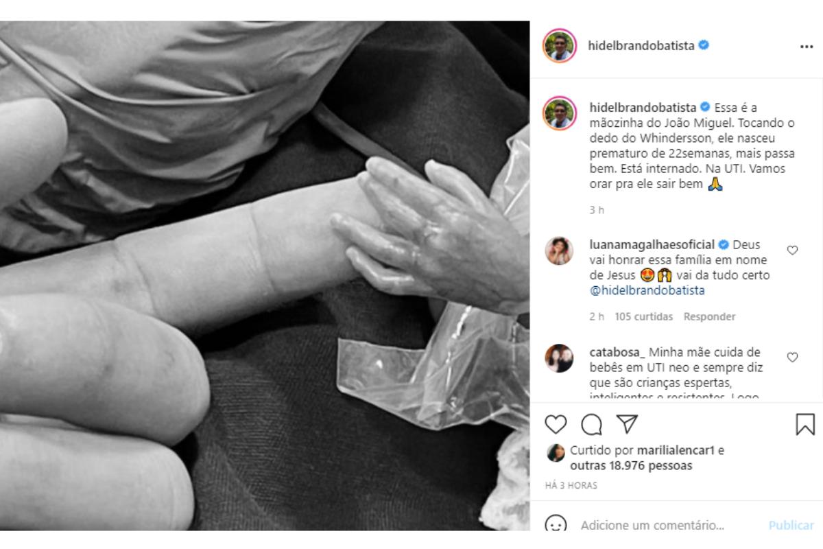 “Essa é a mãozinha do João Miguel. Tocando o dedo do Whindersson”, escreveu na legenda. “Ele nasceu prematuro de 22 semanas, mas passa bem. Está internado. Na UTI. Vamos orar pra ele sair bem”, declarou para os seguidores. Nos comentários, o pai do humorista ainda desabafou: “Estou chorando! Um misto de angústia invade meu coração, não sei explicar”.