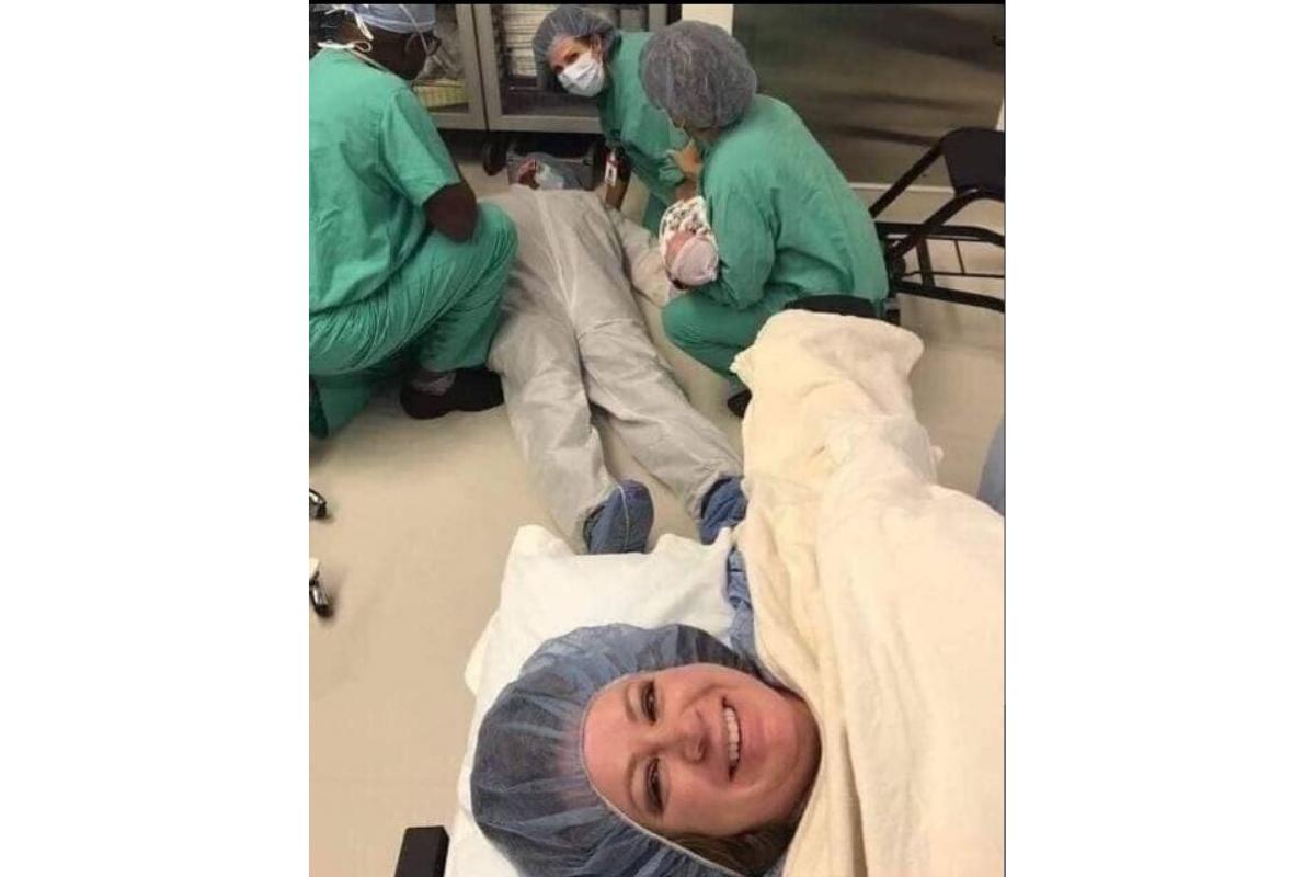 Uma mãe viralizou após tirar uma selfie na sala de parto no momento exato em que o marido desmaiou. Na foto, ela está deitada, com os cabelos presos em uma touca e sorrindo para a câmera enquanto os médicos e enfermeiros ajudam o marido desmaiado.