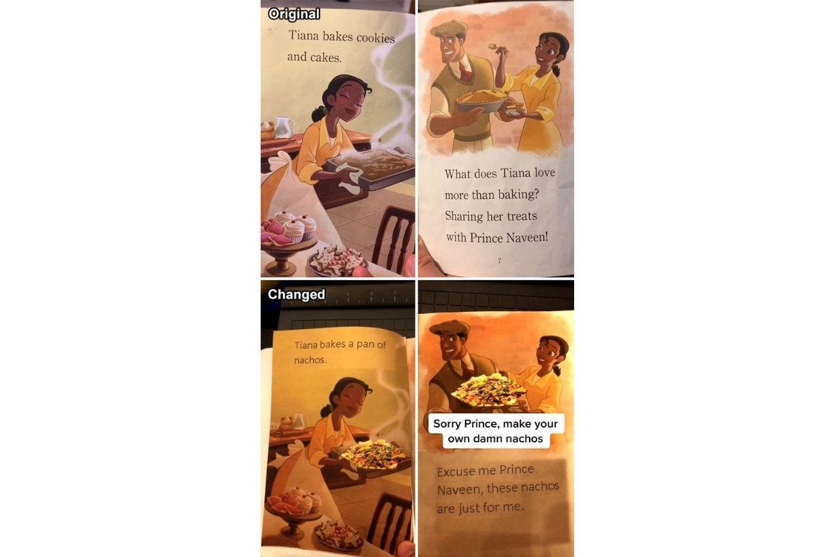 Na história original Tiana cozinha bolos e cookies alimentando o príncipe. Porém na adaptação do pai ele escreve: “Desculpe, príncipe, faça seus próprios nachos”.