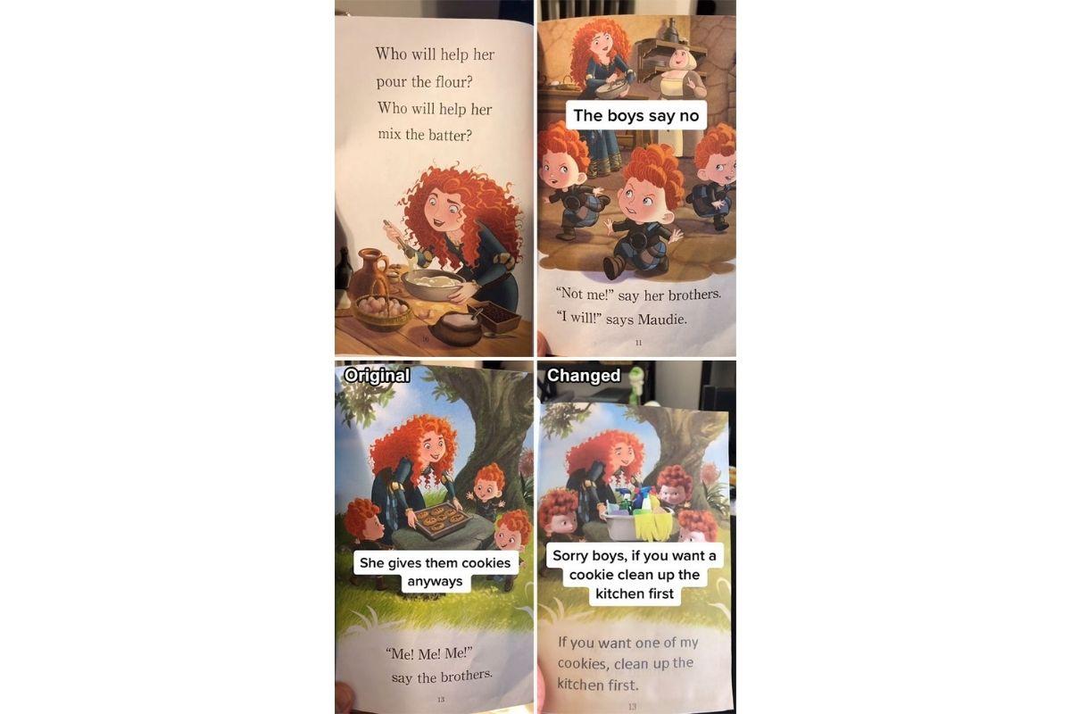Na história original Merida está fazendo biscoitos e pede ajuda. Os meninos dizem que não e ela lhes dá biscoitos de qualquer maneira. Na adaptação do pai ele escreveu: “Desculpe, meninos, se vocês querem um biscoito, limpem a cozinha primeiro”.