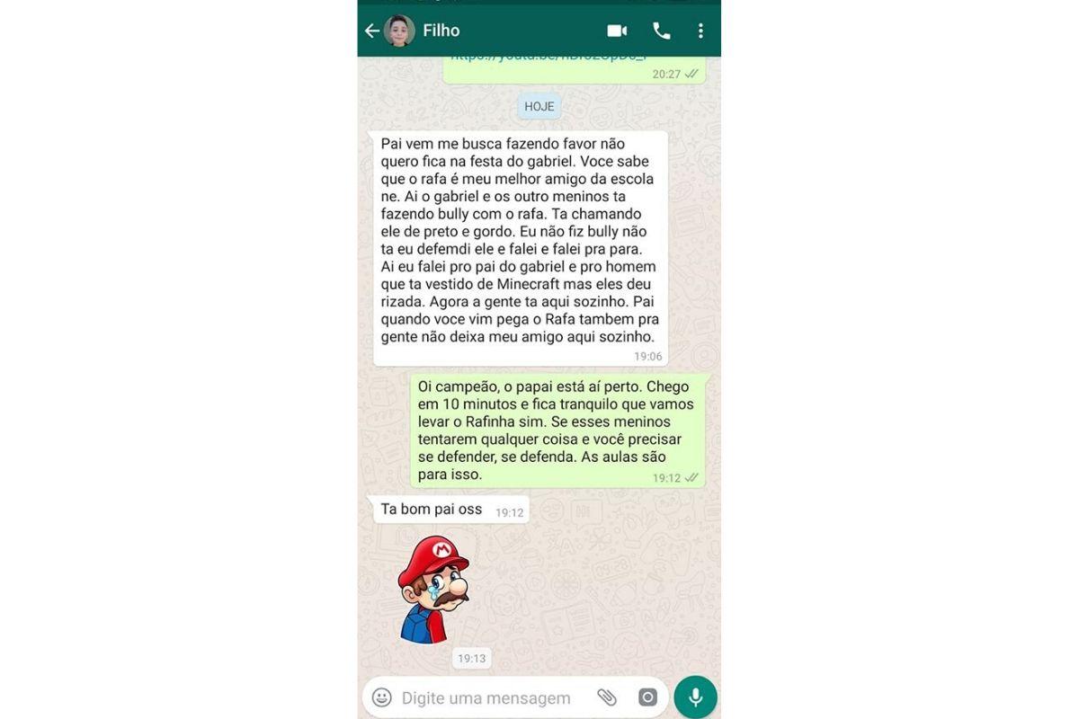 “Pai, vem me buscar, fazendo favor, não quero ficar na festa do Gabriel. Você sabe que o Rafa é meu melhor amigo da escola, né. Aí o Gabriel e os outros meninos tão fazendo bullying com o Rafa. Tão chamando ele de preto e gordo. Eu não fiz bullying não, tá? Eu defendi ele e falei pra parar”, desabafou pelas mensagens.