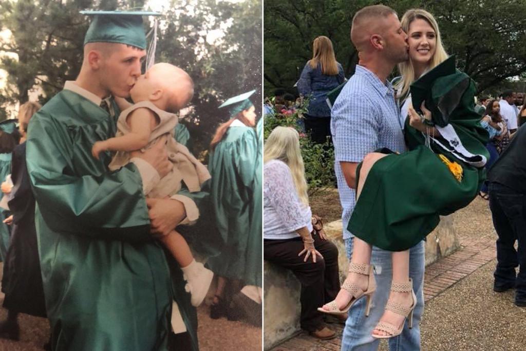 Com a temporada de graduação em pleno andamento, estudantes de todos os lugares estão compartilhando fotos de seus momentos marcantes, mas as fotos comemorativas de um pai com a filha estão voltando às mídias sociais novamente.Tori Roach, 19 anos, compartilhou uma imagem no Twitter de seu grande dia em maio de 2018, quando se formou na Huntsville High School, no Texas, e aproveitou a oportunidade para homenagear o pai. Em uma tentativa de recreação, a menina é mostrada como um bebê no braço de seu pai, enquanto ele comemorava a própria graduação na mesma escola. Ao lado da foto, a recém-formada do ensino médio compartilhou uma foto de si mesma novamente nos braços do pai, enquanto ele dava um beijo na bochecha. “18 anos depois”, ela escreveu na legenda.