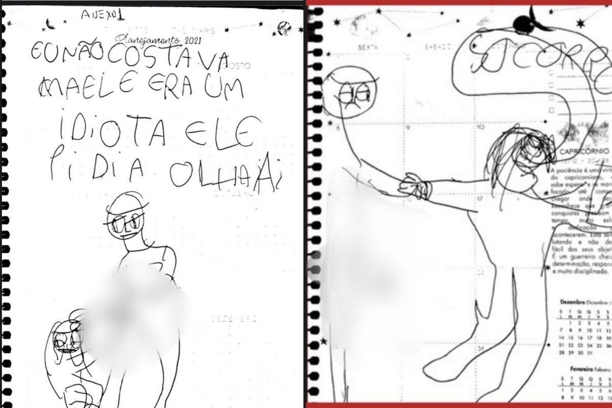 Os desenhos, feitos em caderno que as crianças ganharam da avó materna, têm cunho sexual e foram divulgadas pela Polícia Civil. Tanto a avó quanto a mãe das meninas contaram, durante a investigação, que o comportamento das meninas mudou e que passaram a ficar mais agressivas, irritadiças e chorosas.