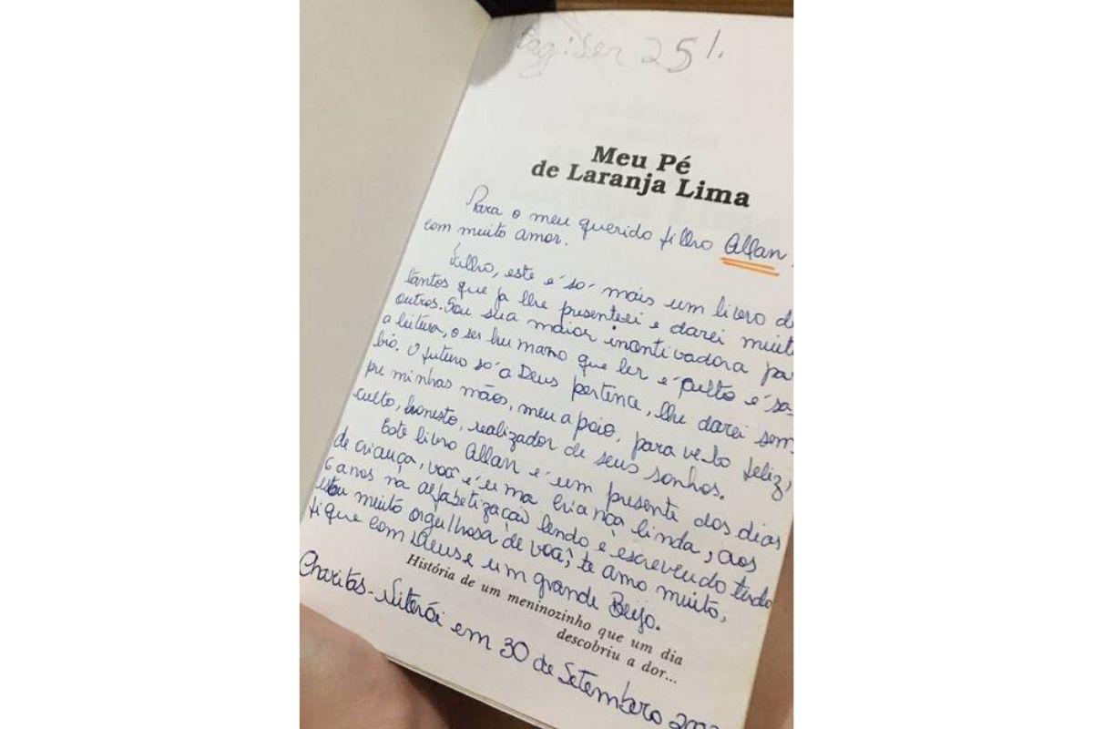 Este livro, Allan, é um presente dos dias de criança. Você é uma criança linda, aos 6 anos na alfabetização lendo e escrevendo tudo. Estou muito orgulhosa de você. Te amo muito, fique com Deus e um grande beijo”.