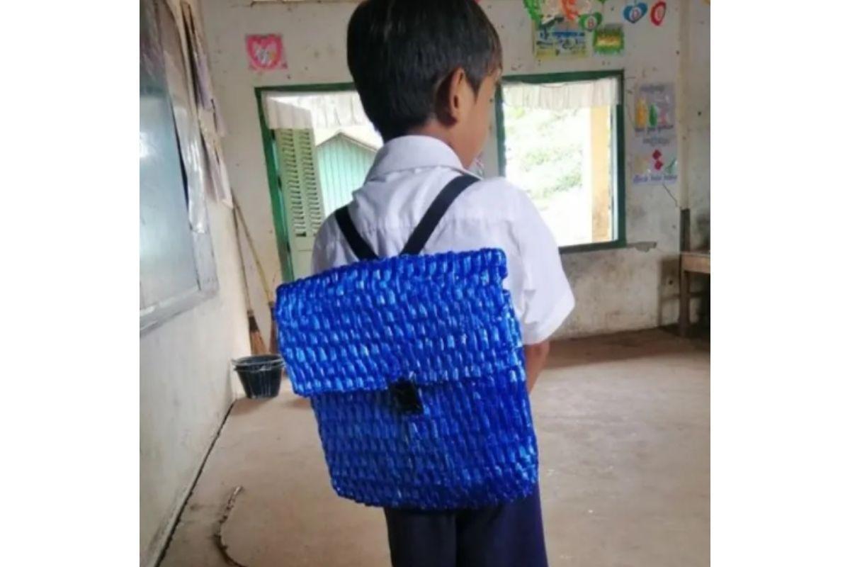 Um pai, de Camboja, resolveu fazer uma mochila artesanal de fibra para que o filho, de 5 anos, consiga ir à escola. A família passa por dificuldades financeiras, portanto, não possuem condições financeiras para comprar uma bolsa nova.