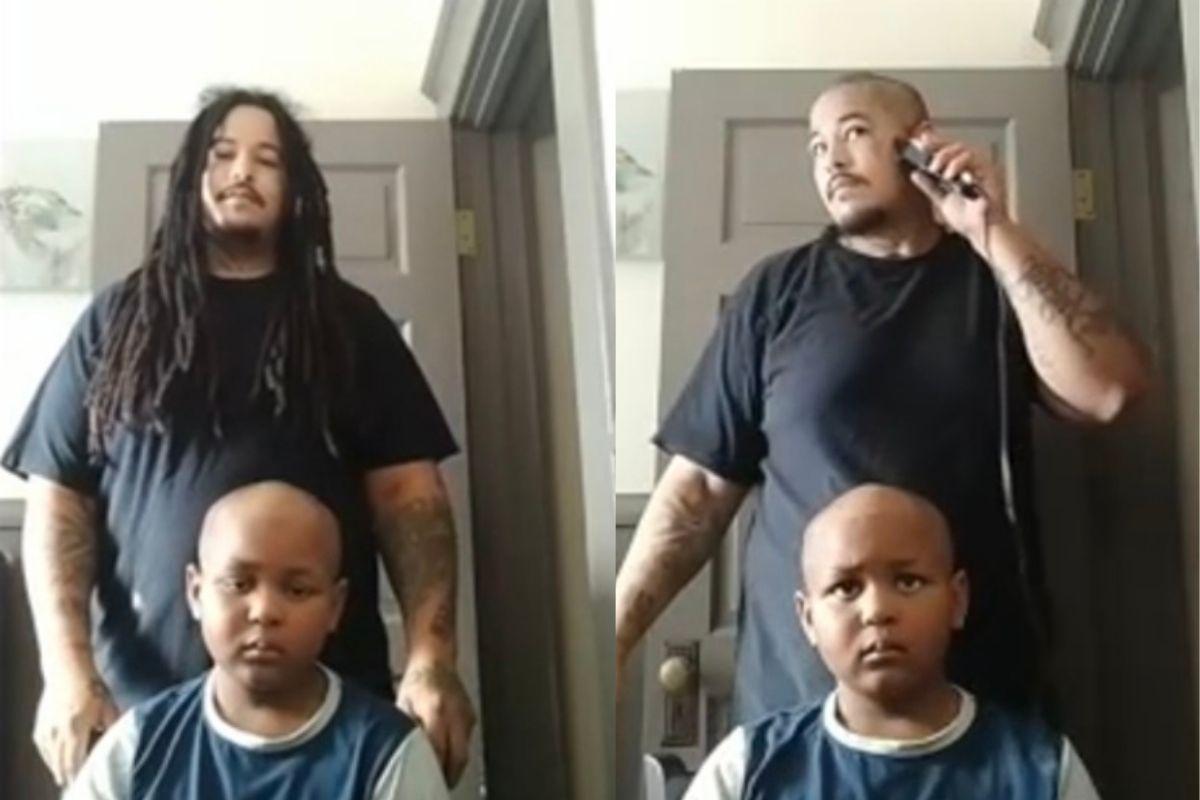 O pai Rayshawn Mims, raspa a cabeça para apoiar o filho Ahkeem, com câncer aos 7 anos (Foto: Reprodução / Facebook / Rayshawn Mims)