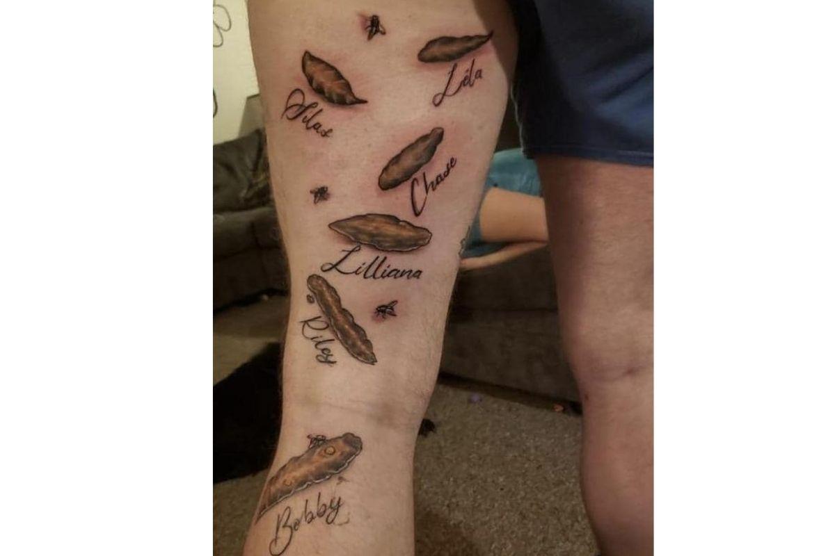 As tatuagens contém os nomes de cada um dos filhos, junto com um esboço do cocô deles. Boa parte dos internautas classificaram a demonstração singular de amor como “nojenta”. Nas fotos, é possível ver que há cinco cocôs na perna do rapaz, com o nome de cada criança abaixo deles, incluindo Bobby, Riley, Lilliana, Chase, Silas e Leila. Para completar o desenho, moscas aparecem voando em volta dos cocôs.