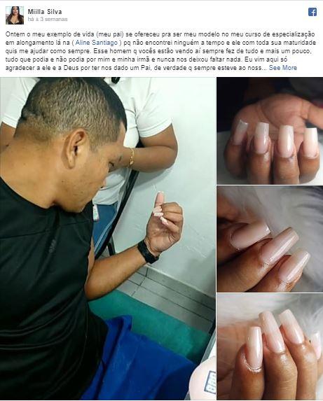 No post ela contou que não tinha encontrado ninguém a tempo de ser modelo do trabalho que ela aprendeu no curso de especialização de alongamento de unhas. “Ontem o meu exemplo de vida (meu pai) se ofereceu pra ser meu modelo. Ele com toda sua maturidade quis me ajudar como sempre”, escreveu na rede social.