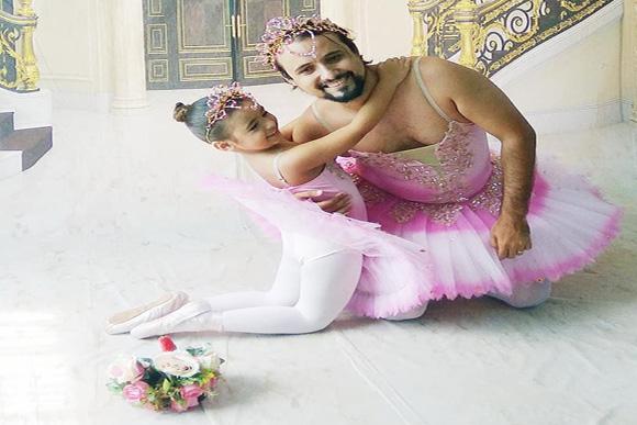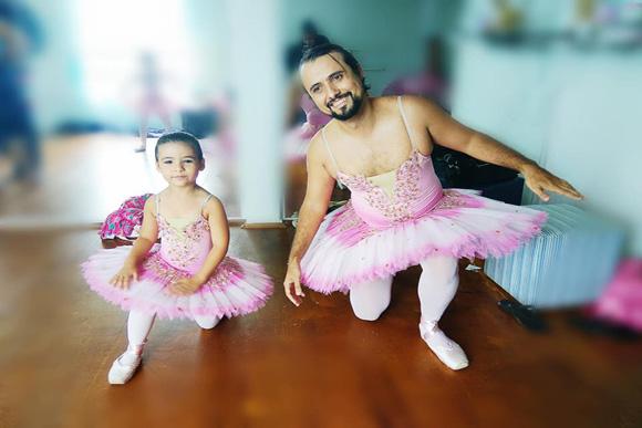 Mirela Lima Chagas, de 5 anos, faz balé há mais de um ano, mas é tímida e não queria participar de um ensaio fotográfico que sua escola de dança tinha organizado para as alunas. Foi então que seu pai, Marcos Vinícius da Costa Chagas, vestiu uma roupa de balé para encorajar a filha a participar do evento. Demais!