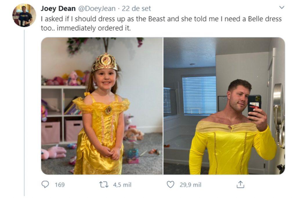 Ele publicou uma foto com a fantasia da Bela, do clássico filme da Disney, A Bela e a Fera e justificou a atitude na legenda: “Eu perguntei para ela se deveria me vestir de fera e ela me disse que eu também precisava de um vestido da Bela”.