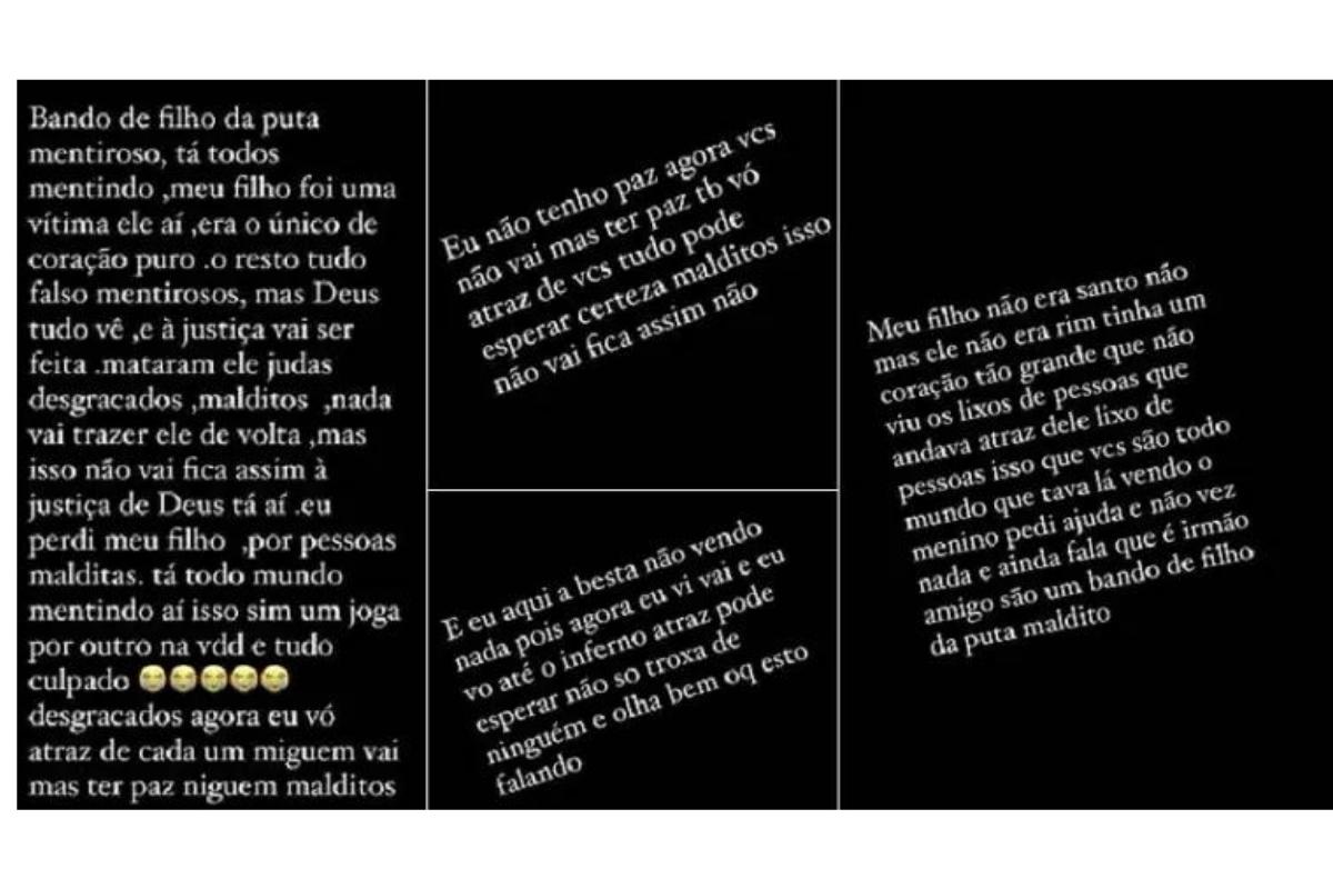 Ela afirmou que não vai parar até achar o culpado da morte do filho: “Eu não tenho paz [e] agora vocês não vão mais ter paz também. Vou atrás de vocês tudo, pode esperar. Certeza, malditos, isso não vai ficar assim, não. E eu aqui a besta não vendo nada, pois agora eu vi e eu vou até o inferno atrás, pode esperar. Não sou trouxa de ninguém e olha bem o que estou falando. Meu filho não era santo, não, mas ele não era ruim. Tinha um coração tão grande que não viu os lixos de pessoas que andava atrás dele. Lixo de pessoas, isso que vocês são todo mundo que tava lá vendo o menino pedindo ajuda e não fez nada. Ainda fala que é irmão, amigo, são um bando de filho da put*, maldito!”