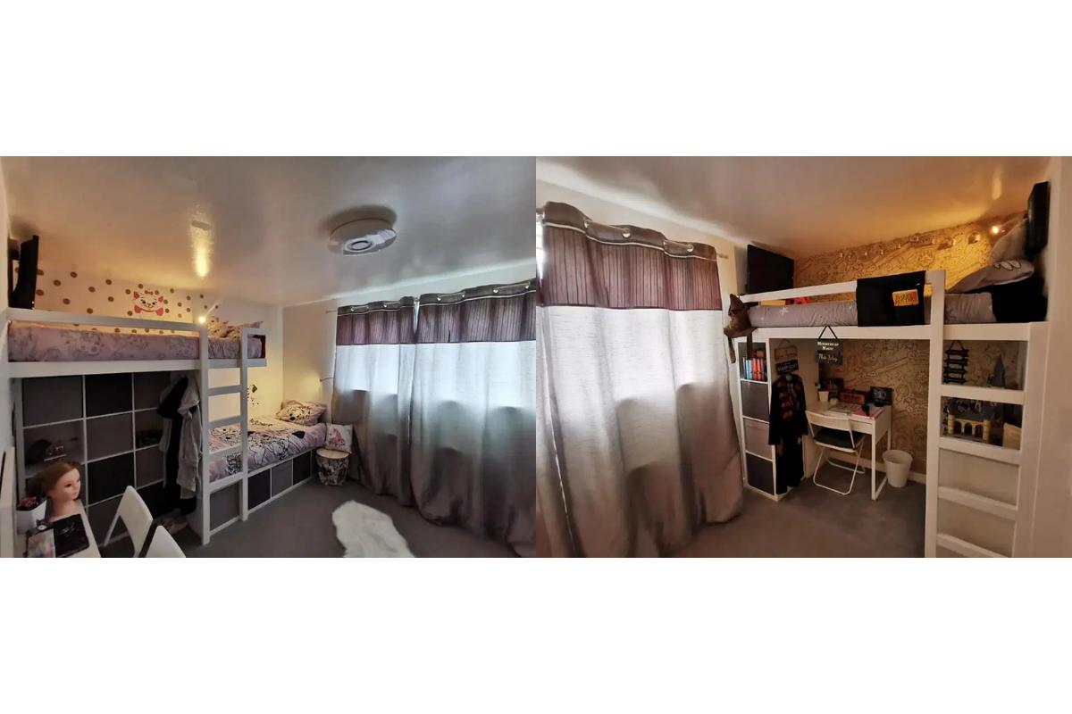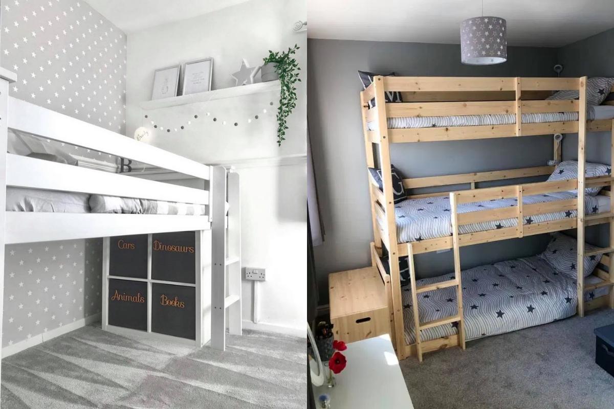 Muitos sugeriram que ela trocasse de quarto com a filha, mas nem sempre isso é necessário. Muitos pais mostraram que colocar uma cama alta é a solução perfeita e funciona bem em todos os casos. Uma mãe que tem três meninas compartilhou a foto do quarto que elas dividem, após ter instalado as camas altas e por sobrar um espaço entre o estrado da cama e o chão, ali cabe uma escrivaninha com gavetas e o chão fica mais espaçoso para elas poderem brincar, do outro lado do quarto, tem duas camas e dá a sensação de que o quarto é maior, além disso, elas têm um espaço extra para guardar seus pertences.