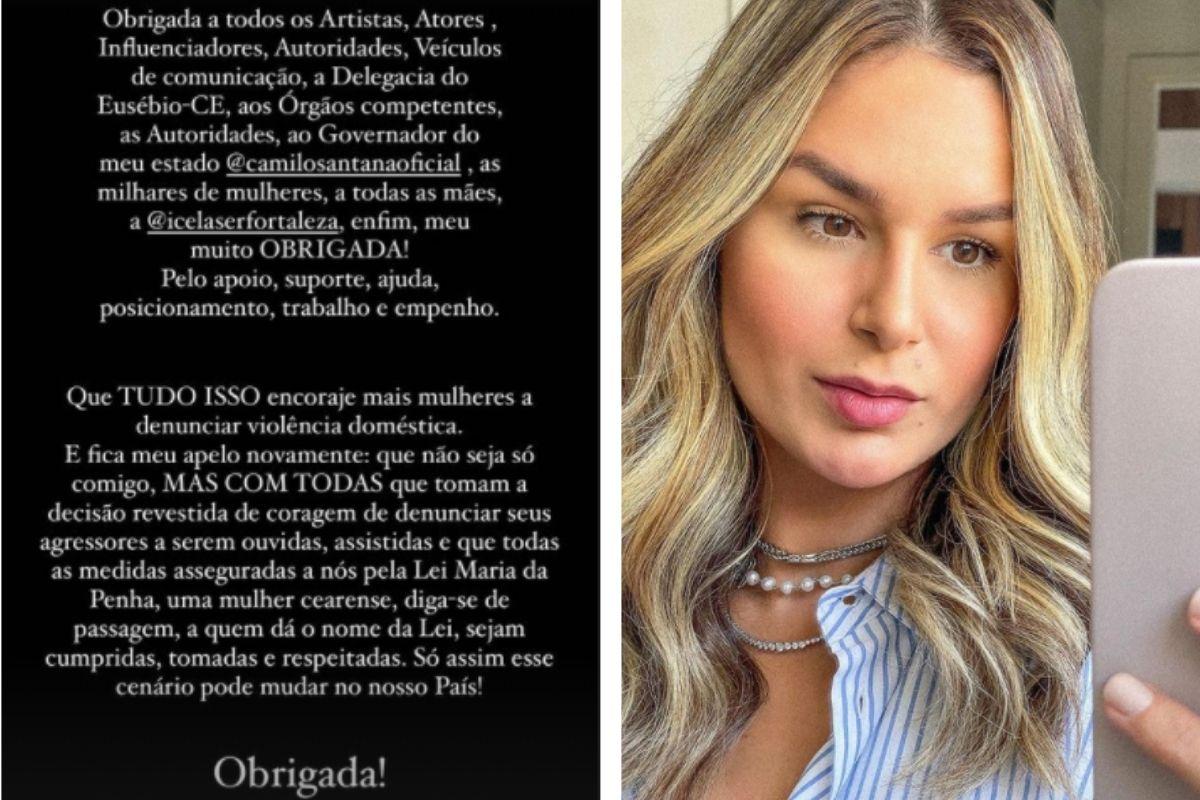 “Obrigada a todos os Artistas, Atores, Influenciadores, Autoridades, Veículos de Comunicação, à Delegacia do Eusébio – CE, aos órgãos competentes, às Autoridades, ao Governador do meu estado, as milhares de mulheres, a todas as mães. Enfim, meu muito OBRIGADA! Pelo apoio, suporte, ajuda, posicionamento, trabalho e empenho”, começou ela, agradecendo.