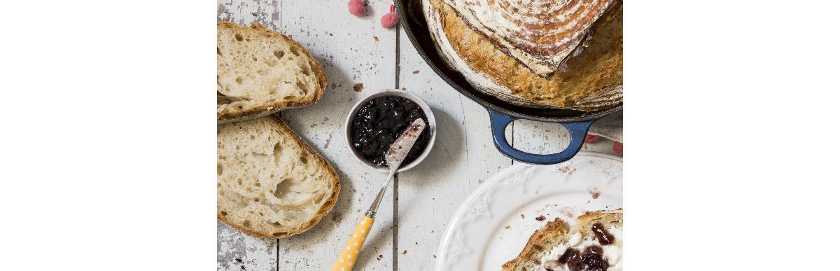 - (cocção) – Pelo menos 20 minutos antes de assar o pão, coloque uma panela de ferro com tampa no forno alto (260°C). Quando estiver aquecido, e o pão fermentado, retire a panela do forno com luvas, vire o pão sobre uma folha de papel manteiga, corte o pão com a tesoura ou lâmina e coloque o pão dentro da panela. Tampe a panela e leve ao forno e abaixe a temperatura para 230 graus. Deixe assar por 30 minutos com tampa, tire a tampa e deixe o pão caramelizar até a cor desejada. Retire do forno e deixe esfriar completamente antes de cortar ou guardar. Conserve em saco plástico.