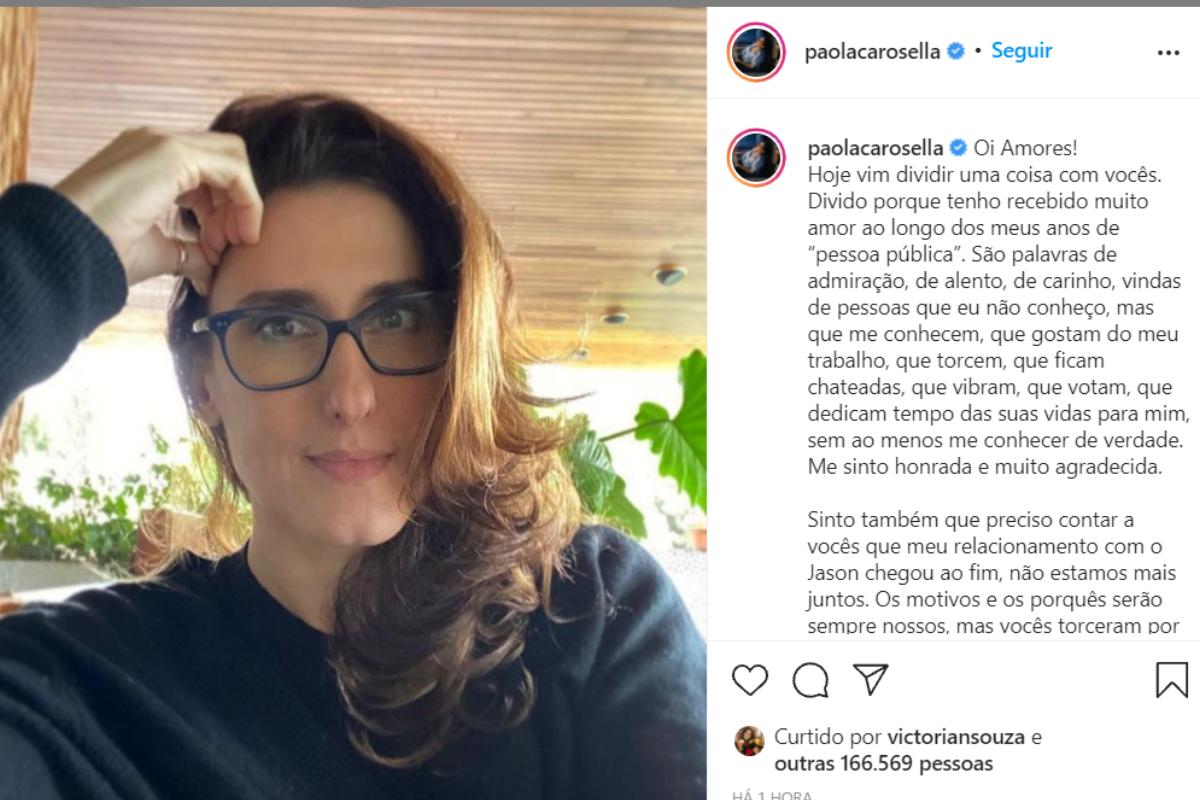 Foi por meio de uma selfie compartilhada que a chefe de cozinha anunciou o término para os fãs que acompanham o seu trabalho. Na legenda da publicação, Paola começou escrevendo: “Hoje vim dividir uma coisa com vocês. Divido porque tenho recebido muito amor ao longo dos meus anos de “pessoa pública”. São palavras de admiração, de alento, de carinho, vindas de pessoas que eu não conheço, mas que me conhecem, que gostam do meu trabalho, que torcem, que ficam chateadas, que vibram, que votam, que dedicam tempo das suas vidas para mim, sem ao menos me conhecer de verdade. Me sinto honrada e muito agradecida”. Para conferir esta publicação, clique aqui.