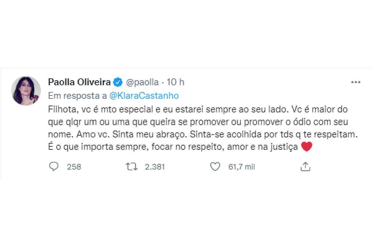 No Twitter, Paolla Oliveira, que interpretou a mãe da personagem de Klara na novela Amor à Vida, em 2013, também se pronunciou sobre o assunto. Em resposta ao relato, ela escreveu: “Filhota, você é mto especial e eu estarei sempre ao seu lado. Você é maior do que qualquer um ou uma que queira se promover ou promover o ódio com seu nome. Amo você. Sinta meu abraço. Sinta-se acolhida por todos que te respeitam. É o que importa sempre, focar no respeito, amor e na justiça”.