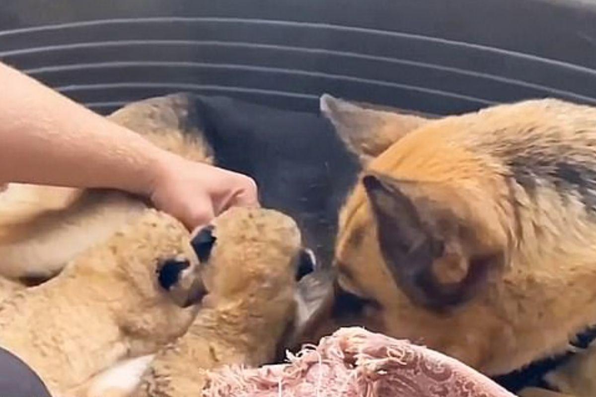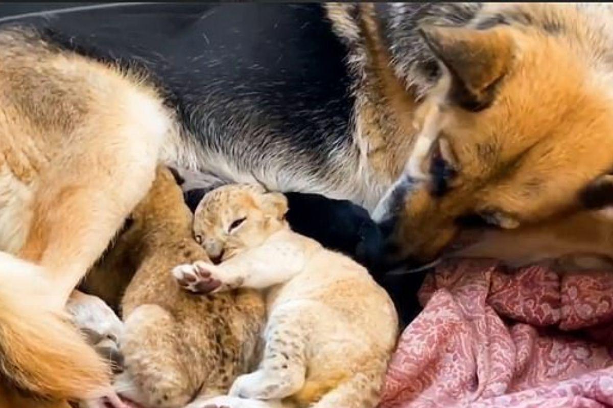 Uma cachorra adotou dois filhotes de leão após os animais serem abandonados na cidade russa de Vladivostok. O município tem um parque de leões, para onde os irmãos foram levados imediatamente. Lá, foram recebidos pela nova mãe, a pastora-alemã Sandra.