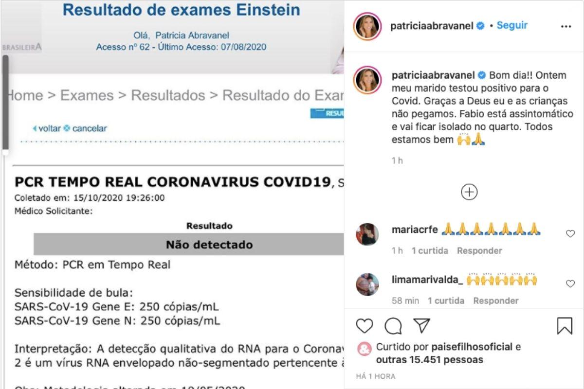 “Bom dia!! Ontem meu marido testou positivo para o Covid. Graças a Deus eu e as crianças não pegamos. Fabio está assintomático e vai ficar isolado no quarto. Todos estamos bem”, legendou a famosa na foto em que mostrava o resultado negativo para a doença.