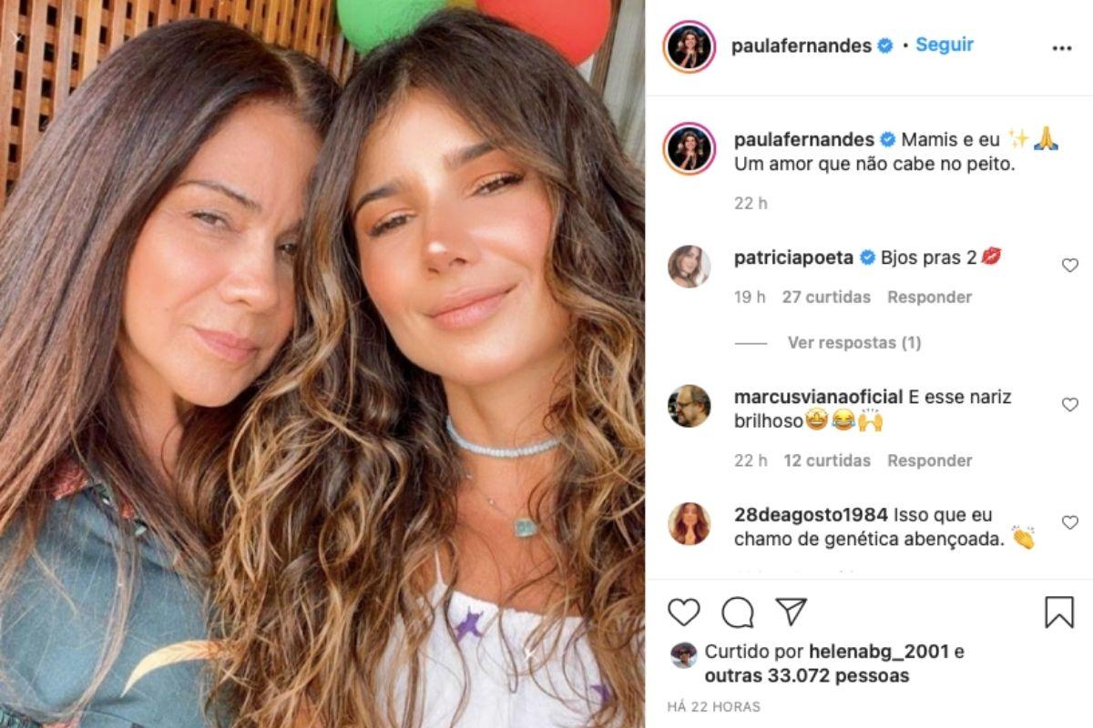 Na última quarta-feira, 25 de novembro, Paula Fernandes compartilhou foto ao lado da mãe, Dulce de Souza. A cantora ainda aproveitou a publicação para prestar homenagem à parente. “Mamis e eu… Um amor que não cabe no peito”, escreveu a sertaneja na legenda.