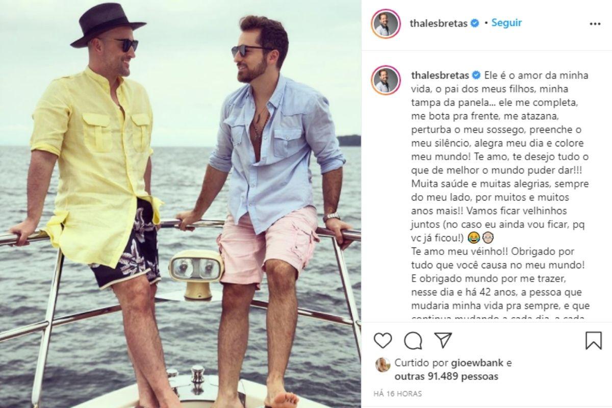 Thales Breta também não deixou a data passar em branco nas redes sociais e publicou uma foto ao lado de Paulo Gustavo na noite da quinta-feira. O médico se declarou para o marido na legenda da imagem. Veja: