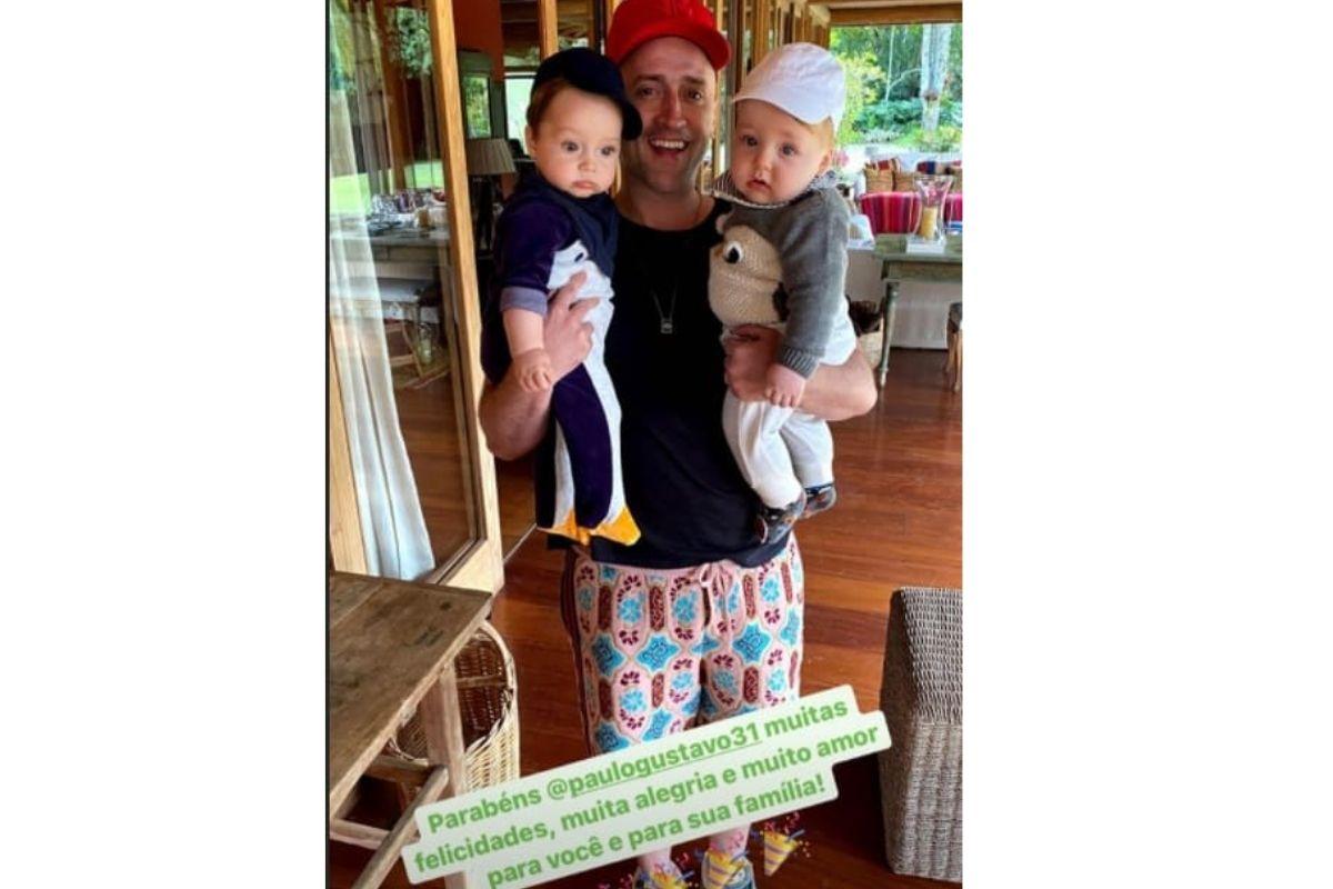 Na foto, o ator aparece segurando Romeu e Gael no colo. Além disso, pai e filhos aparecem “combinando” e usando bonés. Os gêmeos são fruto do relacionamento de Paulo com o dermatologista Thales Breta, com quem o artista é casado desde 2015. Para conceber os filhos, o casal procurou uma barriga de aluguel nos Estados Unidos.