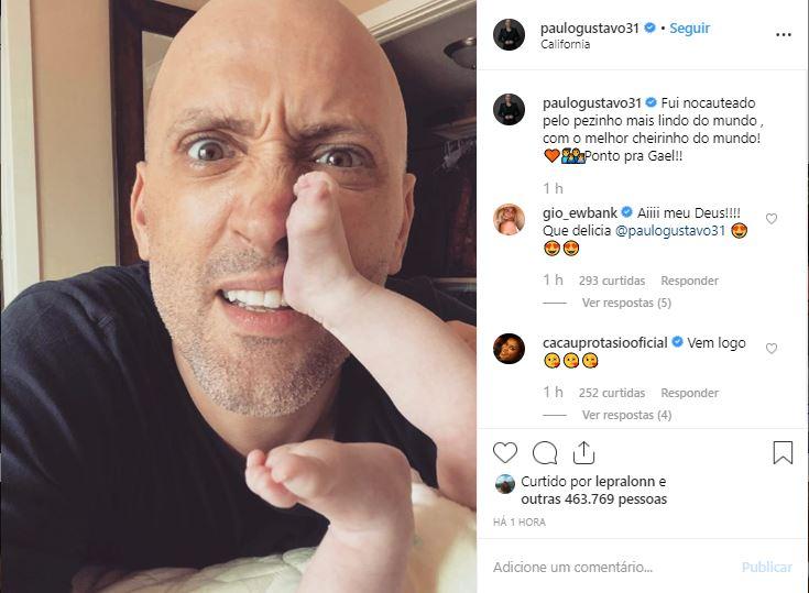Os seguidores e amigos famosos de Paulo Gustavo deixaram muitos comentários na publicação, elogiando o ator e o filho. “Ai meu Deus! Que delícia!”, comentou a atriz Giovanna Ewbank, mãe de Titi e Bless, seus filhos com o ator Bruno Gagliasso. “Paraaaaaa, me derreti aqui”, comentou Sheron Menezzes, mãe de Benjamin, de 1 ano. “Doida pra cheirar esses pezinhos!”, comentou a apresentadora Regina Casé. “Não aguento”, disse Claudia Raia. “Que amorzinho esse papai lindo e cheio de amor”, elogiou Fabiana Karla.