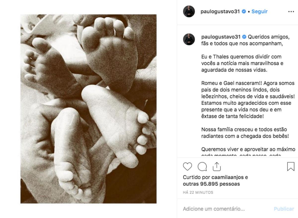 Os gêmeos, batizados de Romeu e Gael, nasceram por meio de uma barriga de aluguel. No dia 18 de agosto, Paulo Gustavo pegou todo mundo de surpresa ao anunciar no Instagram a chegada dos filhos gêmeos. “Eu e Thales queremos dividir com vocês a notícia mais maravilhosa e aguardada de nossas vidas. Romeu e Gael nasceram! Agora somos pais de dois meninos lindos, cheios de vida e saudáveis! Estamos muito agradecidos com esse presente que a vida nos deu e em êxtase de tanta felicidade! Nossa família cresceu e todos estão radiantes com a chegada dos bebês!”, escreveu na legenda da postagem.