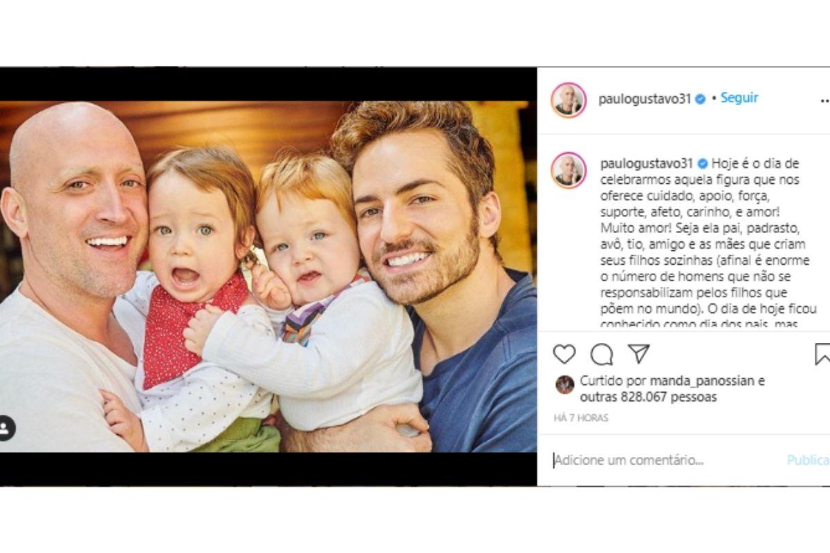 No último domingo, 9 de agosto, o humorista e ator, Paulo Gustavo, compartilhou uma foto ao lado dos filhos inédita no seu Instagram pessoal. O clique super fofo que mostra os filhos Romeu e Gael, que são frutos do casamento dele com o dermatologista, Thales Bretas, chamou a atenção de milhares de pessoas e por isso Paulo decidiu fazer uma reflexão na legenda, sobre o Dia dos Pais.