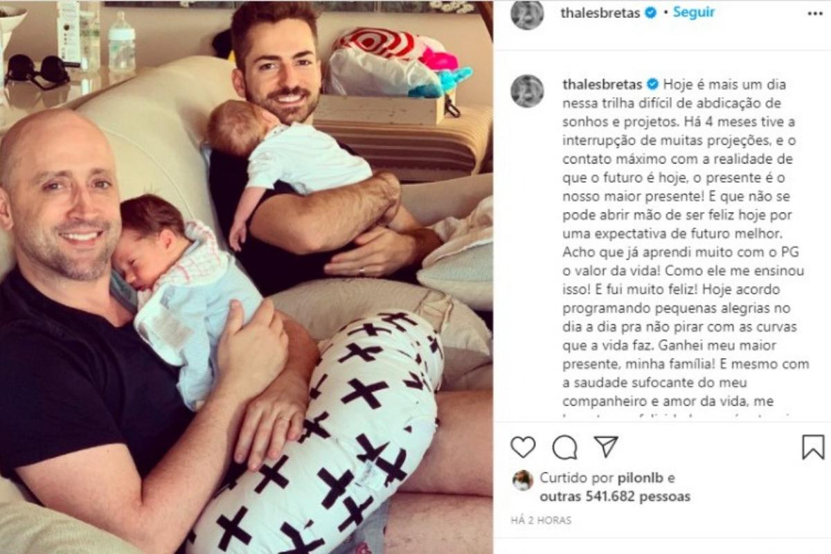 Thales Bretas compartilhou uma foto com o marido Paulo Gustavo neste sábado, 4 de setembro, para falar sobre os 4 meses da morte do humorista por complicações da Covid-19. ” Hoje é mais um dia nessa trilha difícil de abdicação de sonhos e projetos. Há quatro meses tive a interrupção de muitas projeções, e o contato máximo com a realidade de que o futuro é hoje, o presente é o nosso maior presente! E que não se pode abrir mão de ser feliz hoje por uma expectativa de futuro melhor. Acho que já aprendi muito com o PG o valor da vida! Como ele me ensinou isso! E fui muito feliz!”, escreveu.