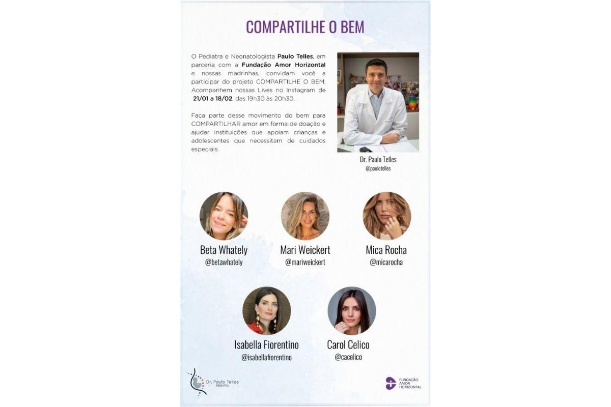 Nesta quinta-feira, 21 de janeiro, a Fundação Amor Horizontal em parceria com Carol Celico e o Pediatra e Neonatologista pela Sociedade Brasileira de Pediatria, Dr Paulo Telles, irão realizar a primeira live, do total de cinco, sobre uma série de saúde da criança e maternidade, chamada Compartilhe o Bem. Durante os encontros, o público poderá conhecer e ajudar o trabalho de ONGs como ACTC Casa do Coração, Associação Nosso Sonho, Cacau – Centro de Apoio à Criança com Anomalia Urológica, Icrim, e o Instituto Adhara.