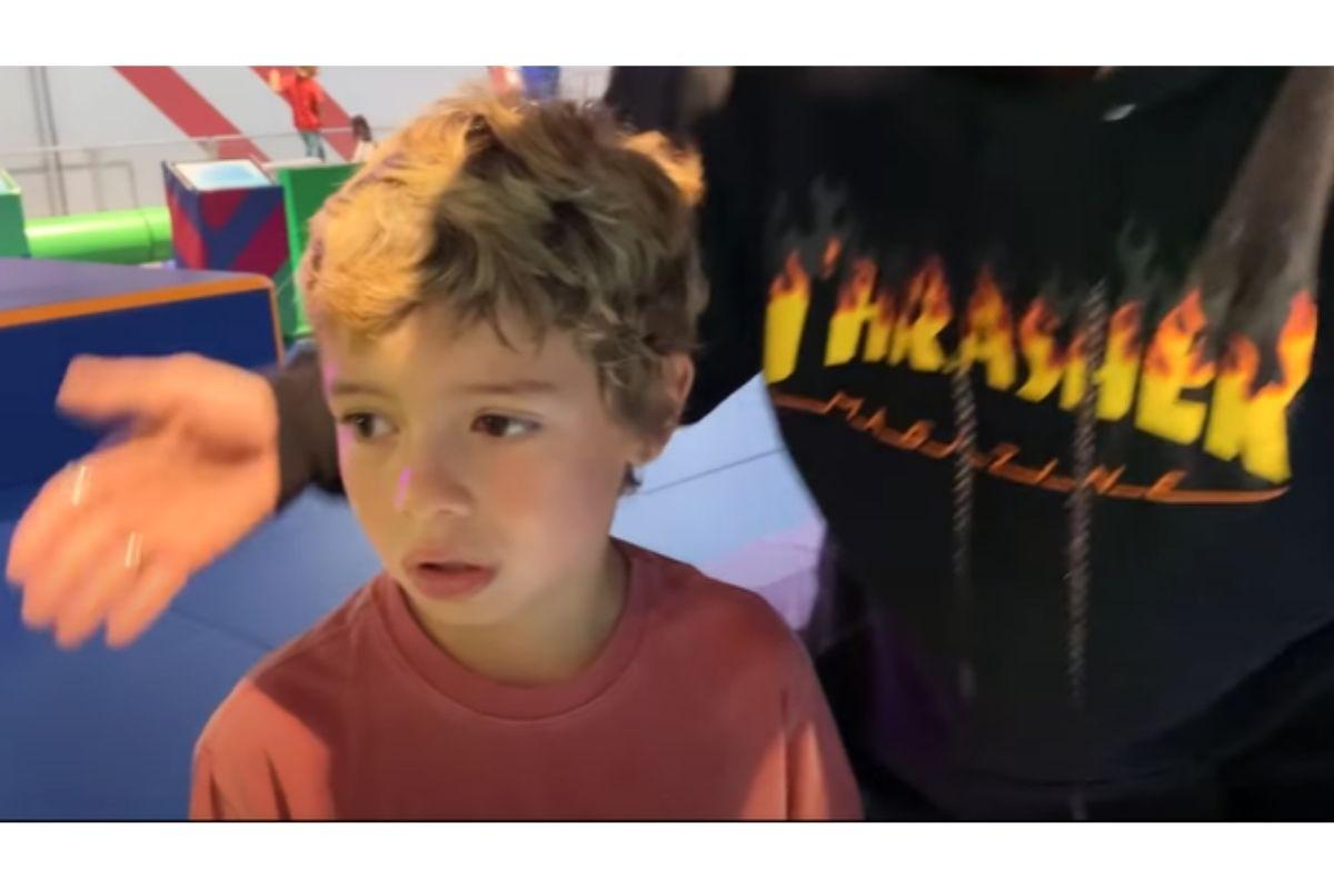 Dom, o filho mais velho do ex-casal, estava com medo da cama elástica (Foto: reprodução / vídeo YouTube)