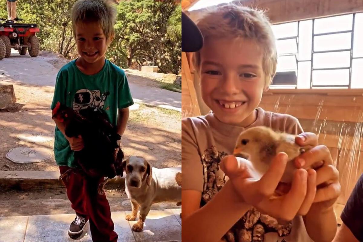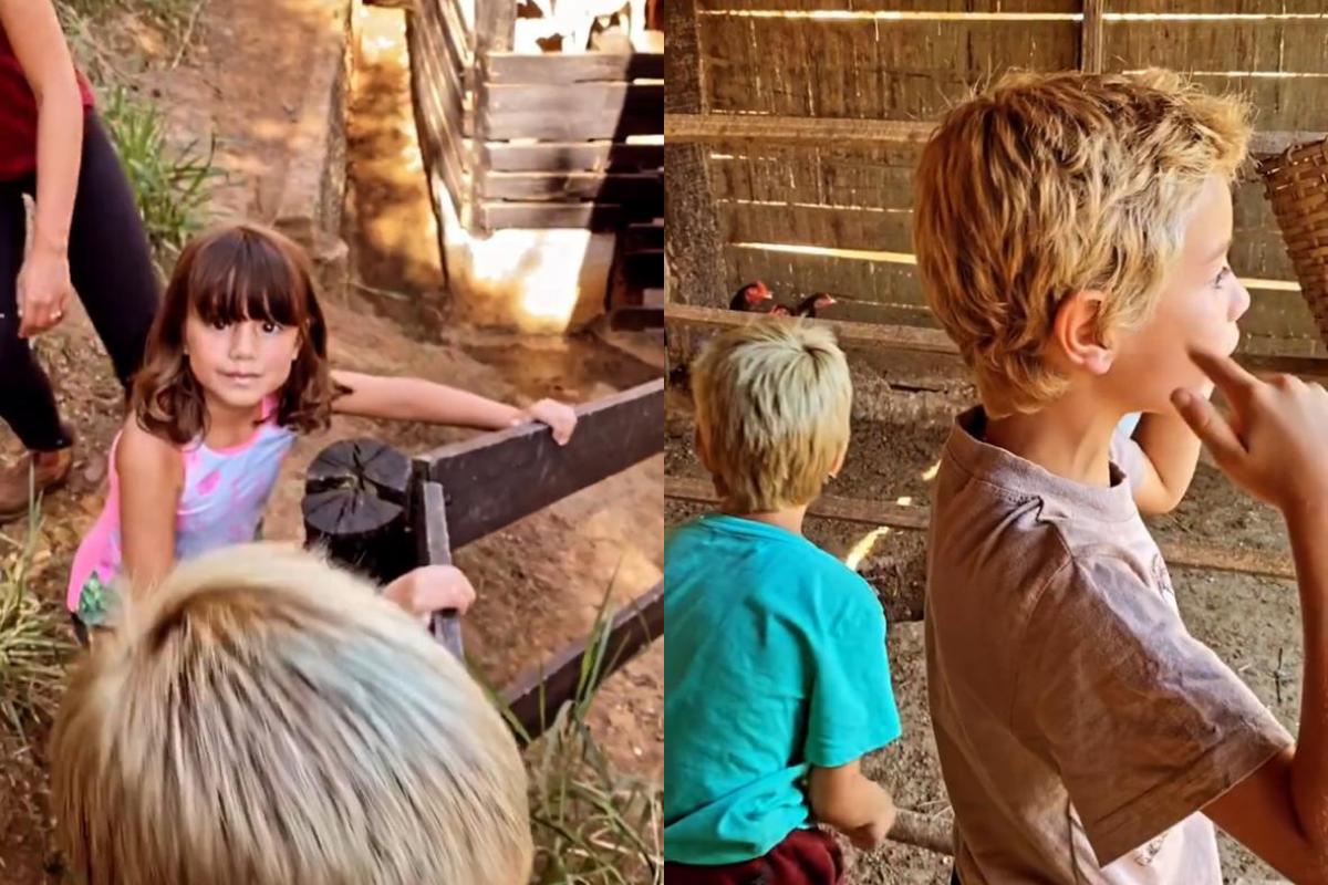 Dom e Bem aparecem primeiro conhecendo um galinheiro e brincando com pintinhos. Depois, Liz também começa a fazer parte das interações do pai nos stories. Ao questionar a filha sobre quais nomes ela daria para dois cavalos, ela disse: “Lua e Lúcia! O menor tem uma [mancha em formato de] lua na testa”.