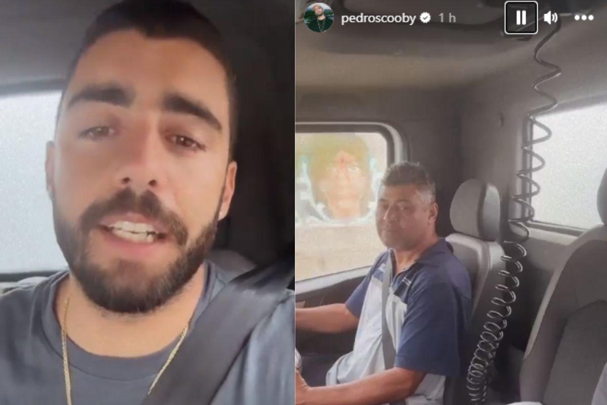 Nas redes sociais, Pedro contou que estava saindo com o carro da modelo que já essa no estacionamento da maternidade há três dias, mas ao sair com ele percebeu que estava com o pneu do carro furado e na chuva forte que caia no momento.