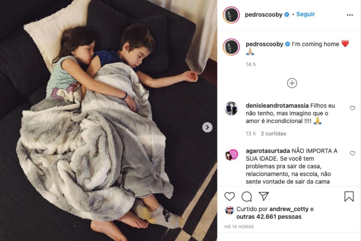 No último sábado, 28 de novembro, Pedro Scooby se derreteu ao compartilhar foto dos filhos nas redes sociais. O surfista é pai de 3 crianças, Dom, Bem e Liz. No primeiro dos cliques estão os gêmeos dormindo juntos em sofá da casa e no segundo o mais velho sendo espoleto e mostrando a língua.