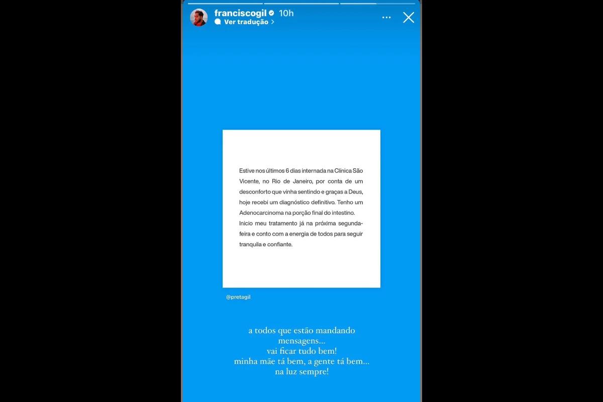 No comunicado é falado: “Estive nos últimos 6 dias internada na Clínica São Vicente, no Rio de Janeiro, por conta de um desconforto que vinha sentindo e, graças a Deus, hoje recebi um diagnóstico definitivo. Tenho um adenocarcinoma na porção final do intestino. Inicio meu tratamento já na próxima segunda-feira e conto com a energia de todos para seguir tranquila e confiante”, escreveu.