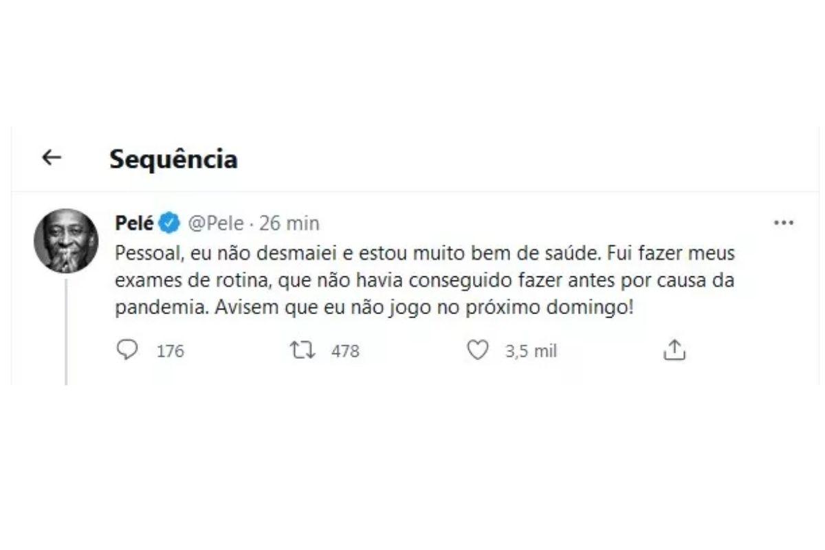 “Fui fazer meus exames de rotina, que não havia conseguido fazer antes por causa da pandemia. Avisem que eu não jogo no próximo domingo!”, brincou ele. Pelé também esclareceu os rumores de que teria desmaiado, “Pessoal, eu não desmaiei e estou muito bem de saúde”.