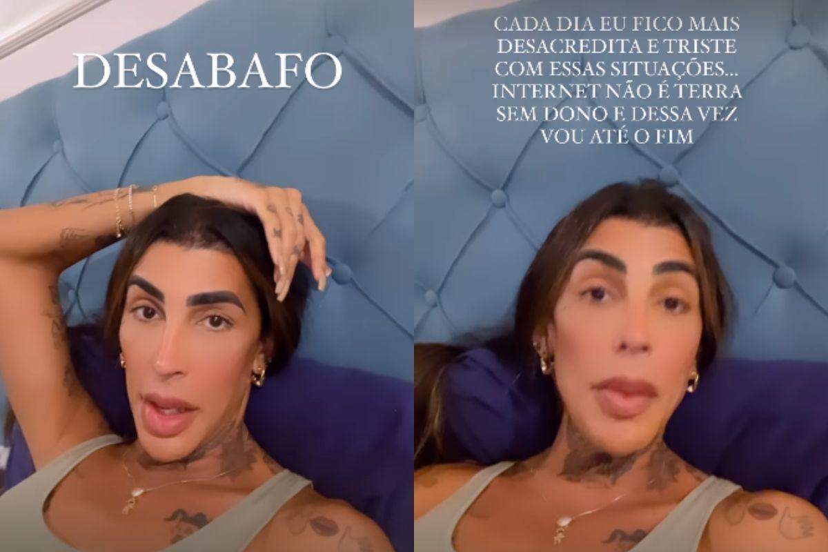 “Dessa vez eu vou falar de um assunto muito sério, essa pessoa me acusou de um crime… Se você não me vê como mulher, o problema é seu! Eu me vejo como mulher e como mãe, e acabou!”, pontuou a mãe de Lucca. “Cada dia eu fico mais desacreditada e triste com essas situações… Internet não é terra sem dono, e dessa vez vou até o fim”, escreveu ela nos stories enquanto compartilhou o que viveu.