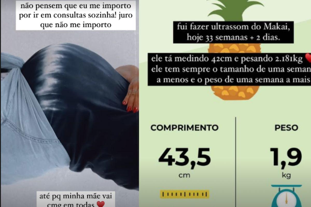 ”Não pensem que eu me importo por ir em consultas sozinhas! Juro que não me importo, até porque minha mãe vai comigo em todas”. ” Fui fazer ultrassom do Makai, hoje 33 semans+ 2 dias”. ”Ele está medindo 42 cm e pesando 2kg, ele tem sempre o tamanho de uma semana a menos e o pesso de uma semana a mais”.