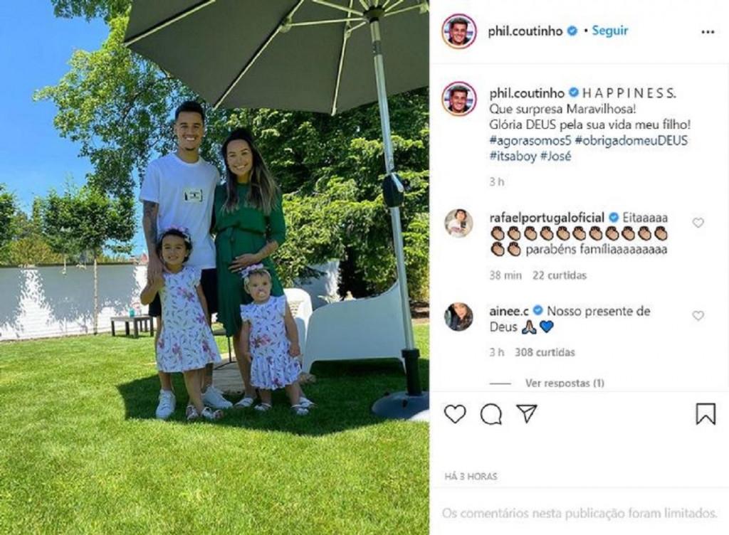 Ao anunciar a gravidez, Philippe Coutinho compartilhou uma foto com a esposa e as duas filhas e disse: “Happiness (Felicidade). Que surpresa Maravilhosa! Glória DEUS pela sua vida meu filho! Agora somos 5! Obrigado meu Deus! É menino! José!”.