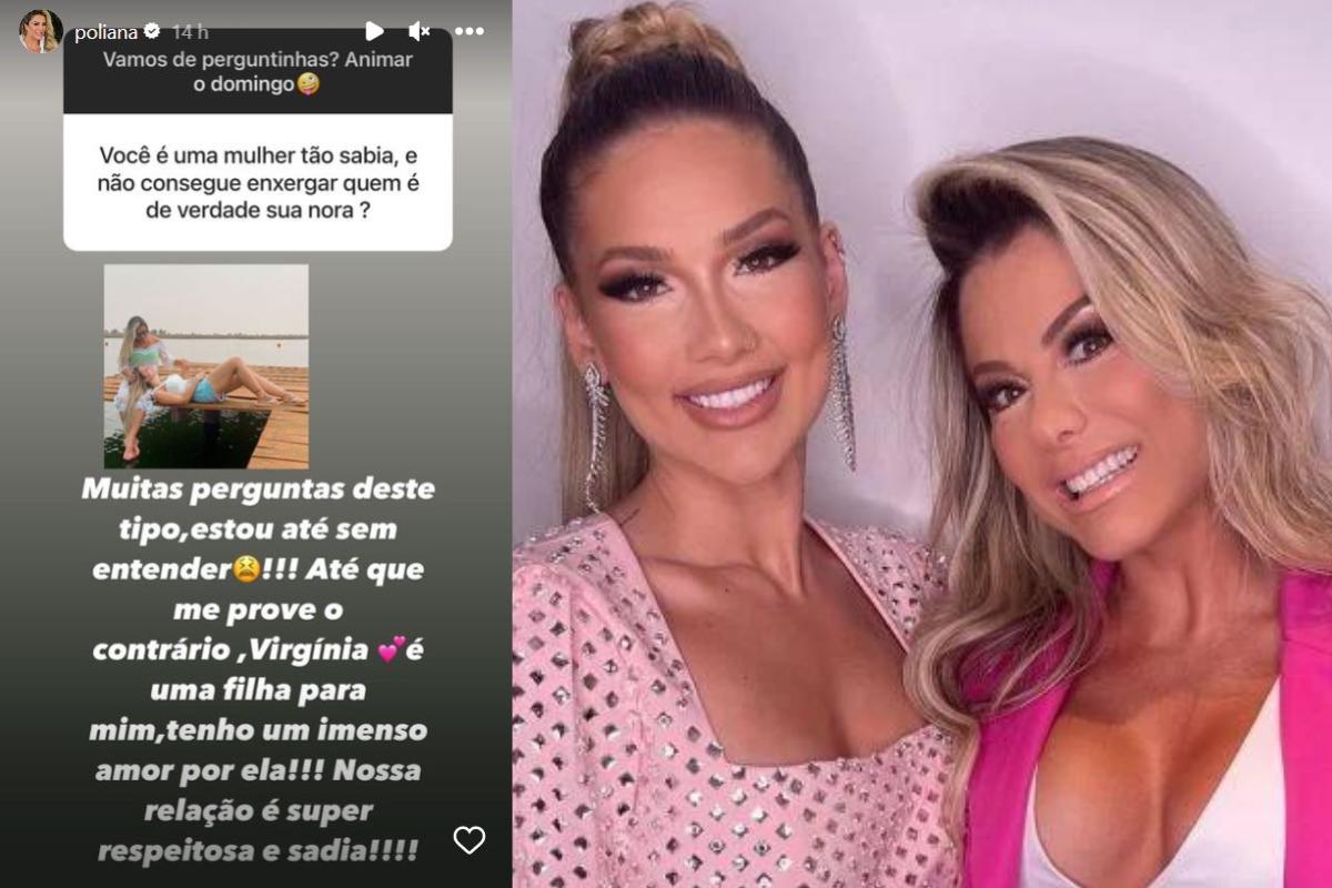 “Muitas perguntas deste tipo, estou até sem entender! Até que me prove o contrário, Virginia é uma filha para mim, tenho um imenso amor por ela! Nossa relação é super respeitosa e saudável”, afirmou Poliana, mostrando seu carinho e apoio à nora.